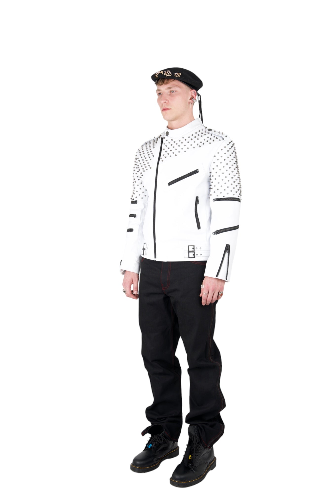 Step into the spotlight with the Nominal London White Leather Studded Biker Jacket, a testament to sophistication and rugged charm. This jacket features handcrafted studded detailing that adds a rebellious edge, perfect for those who dare to stand out.
