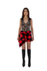 Featuring a striking red and black plaid pattern, this skirt combines the timeless appeal of tartan with a modern, edgy twist.