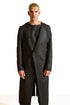 Designed with versatility in mind, this unisex greatcoat fits seamlessly on all body types, offering a flattering silhouette and a minimalist lapel that exudes sophistication. The raw finished edges and leather lace detailing add a touch of artisanal charm, reflecting Olubiyi Thomas's distinctive craftsmanship.