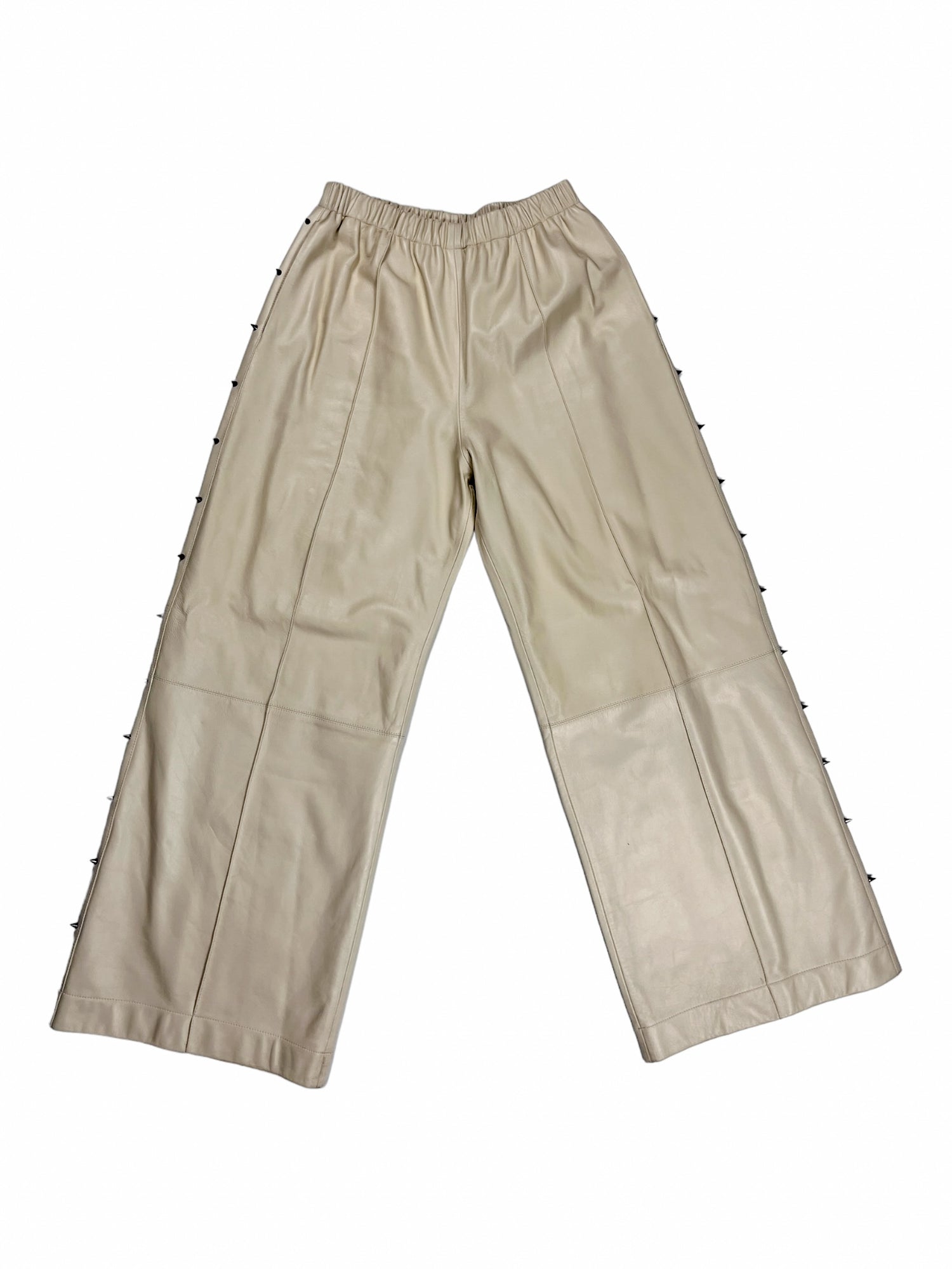 The Nominal London Off White Leather side studded trousers uses sustainably sourced lamb leather specially treated to allow some stretch and features top-quality cone spikes expertly crafted onto the garment. It's cut to fit wide & loose.