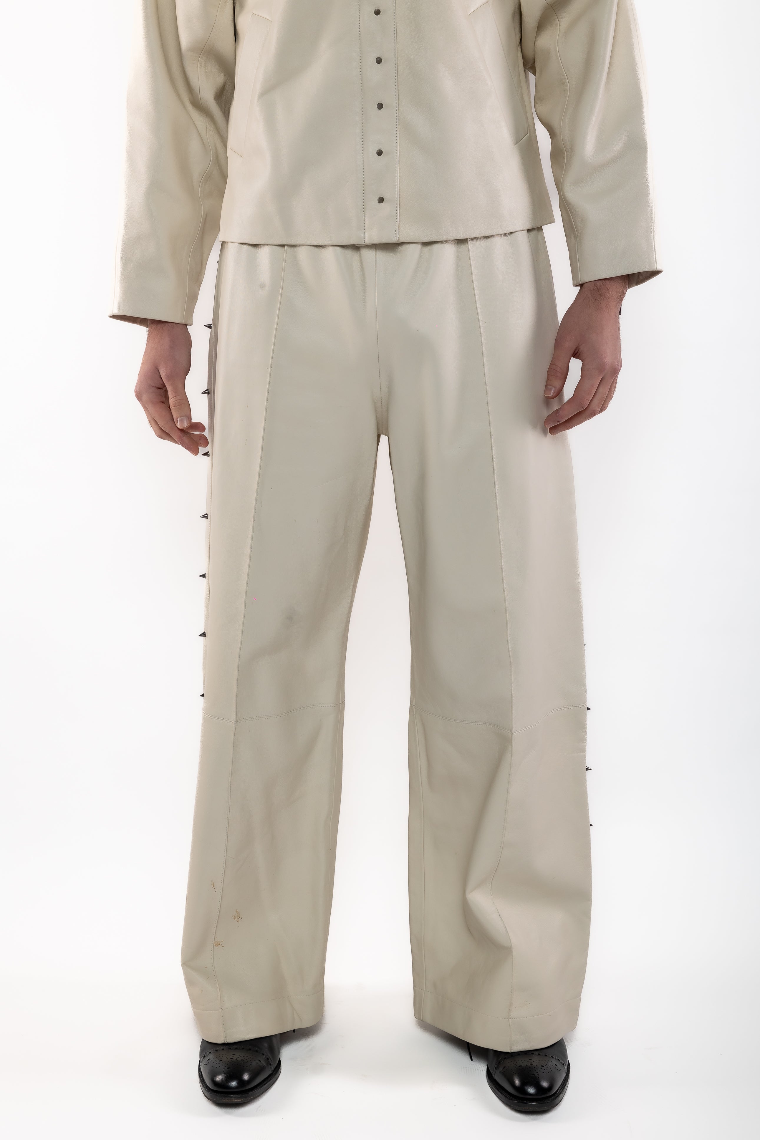 The Nominal London Off White Leather side studded trousers uses sustainably sourced lamb leather features top-quality cone spikes expertly crafted onto the garment. It's cut to fit wide & loose.