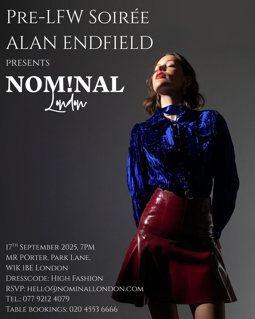 We are pleased to invite all beautiful fashion entrepreneurs, models, industry leaders, and visionary creatives to our Pre-LFW Soirée with Alan Endfield, presenting Nominal London.